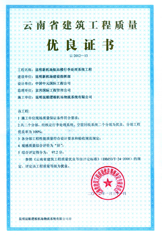 云南省建筑工程質(zhì)量優(yōu)良證書